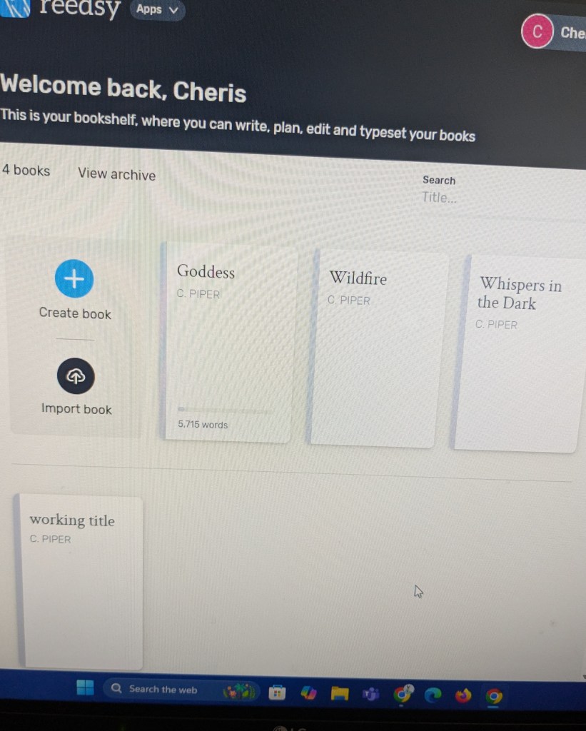 Goddess, as the title suggests, takes place in a realm of gods and goddesses. You will hear some familiar names, but this is not a retelling of known myths. This is a new story all of its own. This will definitely have some female empowerment involved with a strong female main character, along with some of the more common tropes of ‘he falls first’. I’m really looking forward to sharing this one. I have a playlist created that gives a feel for where this book is heading.